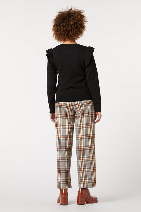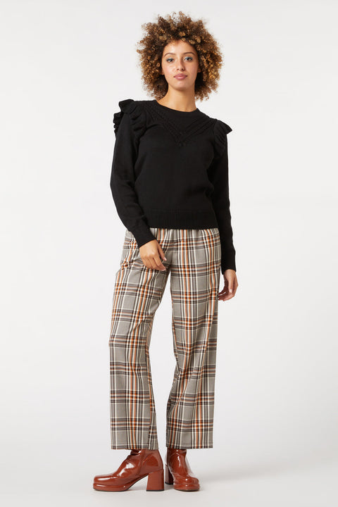 Mys upp i Ruffle Shoulder Sweater från Princess Highway, där sötma möter värme i en symfoni av stil. Denna charmiga tröja, som finns i klassisk svart, har en förtrollande volangdetalj som faller ner över axlarna och ger en lekfull twist till den traditionella vinterplaggen. Mittprydnaden, en slående V-formad kabelstickad detalj, väver sig ner längs framsidan och skapar ett visuellt intresse som är både subtilt och fängslande. Med ribbstickad nederkant, ärmslut och halsringning sitter denna tröja åt alla rätt ställen och erbjuder en åtsittande silhuett som smickrar samtidigt som den håller kylan borta. Tillverkad av en mjuk akryl-bomullsblandning är den den perfekta allierade mot kallare dagar och lovar värme utan att offra stilen. Oavsett om du sitter på ett pittoreskt kafé, strosar genom en bokhandel eller njuter av en vinterpromenad, passar den här tröjan enkelt med dina favoritjeans eller en böljande kjol, vilket gör den till ett mångsidigt tillskott till din garderob som är full av personlighet.