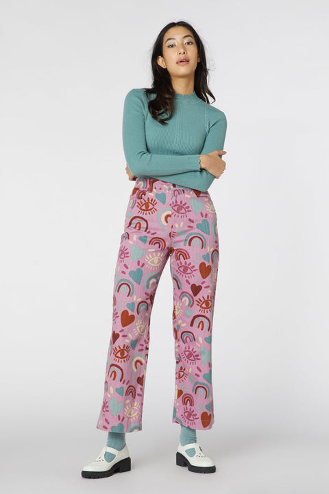 Låt I Love Rainbows-jeansen ta med dig på en kalejdoskopisk resa där handmålade hjärtan, vaksamma ögon och livfulla regnbågar möts i ett oemotståndligt tryck som förklarar din kärlek till allt som är ljust och vackert. Tillverkade av medelviktig bomullsborrning ger dessa jeans komfort utan att snåla på stilen, med en hög midja som kramar dig precis rätt och raka ben som drömmer om äventyr. Med sidofickor för dina hemligheter och påsydda fickor baktill för allt annat är de lika funktionella som de är fantasifulla. Slipp i dessa och förklara djärvt att din garderob är en duk, målad med regnbågarnas glädje.