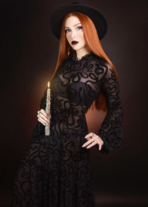 Sloane – Flockad maxiklänning i sammet med ormskinn och klockärmar