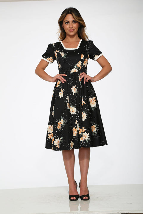 Svart&Gul Blommig Swingklänning