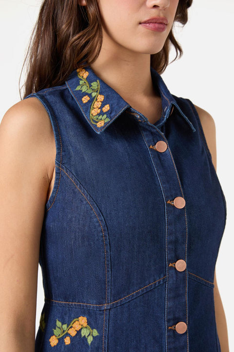 Säg hej till din nya denimdagdröm. Flower Child Embroidered Dress ger en groovy 70-talsanda till en modern minisilhuett, med söta retroblommor sydda på klassisk bomullsdenim. Det är det perfekta plagget att kasta på sig och ta med för bekymmerslösa dagar och avslappnad lager-på-lager-klädsel.