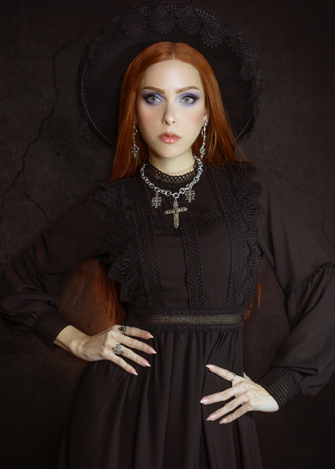 Denna bohemiska, häxiga klänning är perfekt för den kära bortgångne själen. Lätt och midi-lång, med nyp i midjan, dragkedja bak och ballongärmar.
