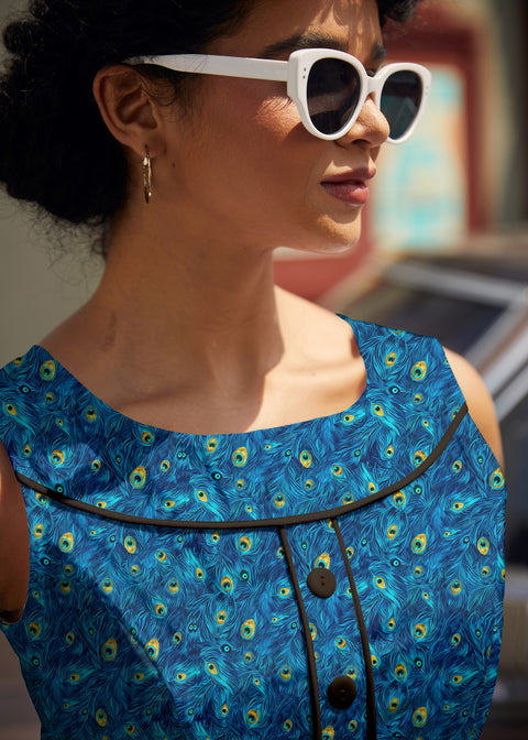Letar du efter en klassisk klänning i vintagestil Vår Elizabeth-modell med alla detaljer är allt du kan önska dig och mer! Denna bomullsklänning, som visas i vårt påfågeltryck, har passpoaldetaljer längs hela överdelen med icke-funktionella knappar fram, midja med figursmickrande veck, en vintageinspirerad, snurrvärdig kjol med dolda sidofickor och dragkedja bak.