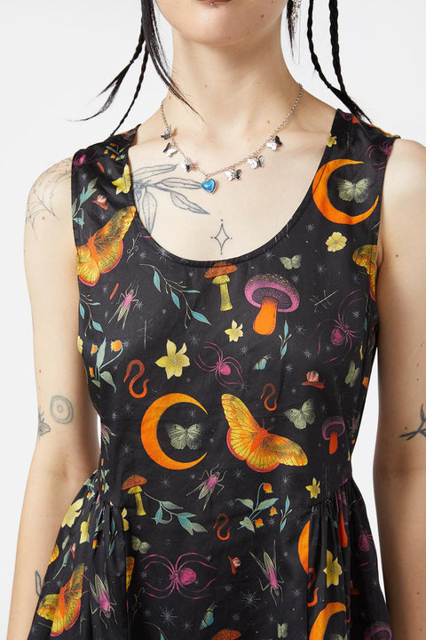 Trädgårdsfestklänningen från Black Friday blommar med fantasifulla konstverk som är som gjorda för att virvla runt under din nästa fest. Med sin klassiska passformade silhuett, runda halsringning och en slät dragkedja baktill är denna skönhet i bomullssatin lika smickrande som den är festlig.