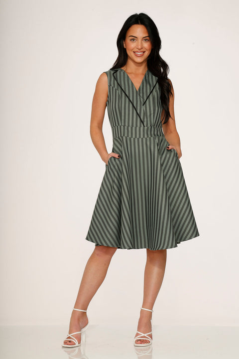 Med skarpa vertikala ränder och en skräddarsydd halsringning med slag ger Orchid Bloom Olive Stripe Swing Dress precis rätt blandning av vintagecharm och modern touch. En smickrande passform och utsvängd silhuett och strukturerad midja gör den perfekt för allt från kontorsarbete till middagsdejter.