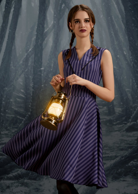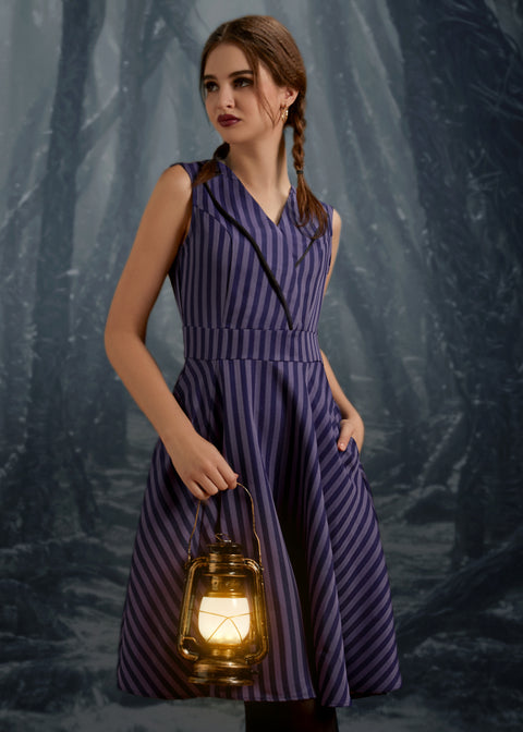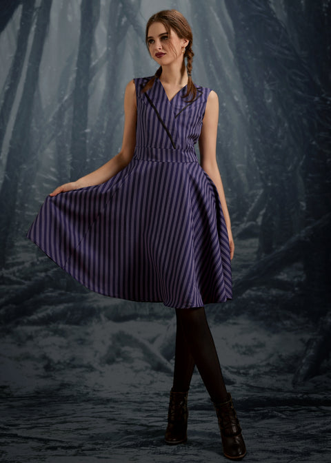Gör ett uttalande i ränder med den svarta och lila randiga swingklänningen från Orchid Bloom. Med en slående kombination av svarta och lila vertikala ränder ger denna vintageinspirerade swingsilhuett en touch av personlighet till din garderob.