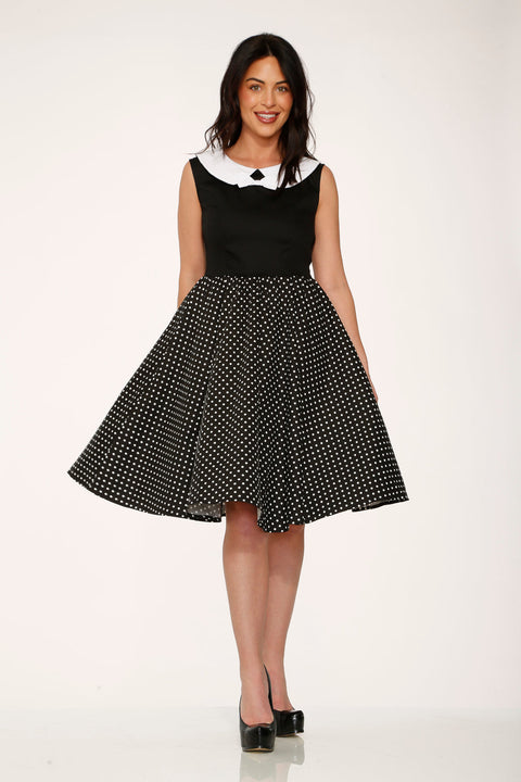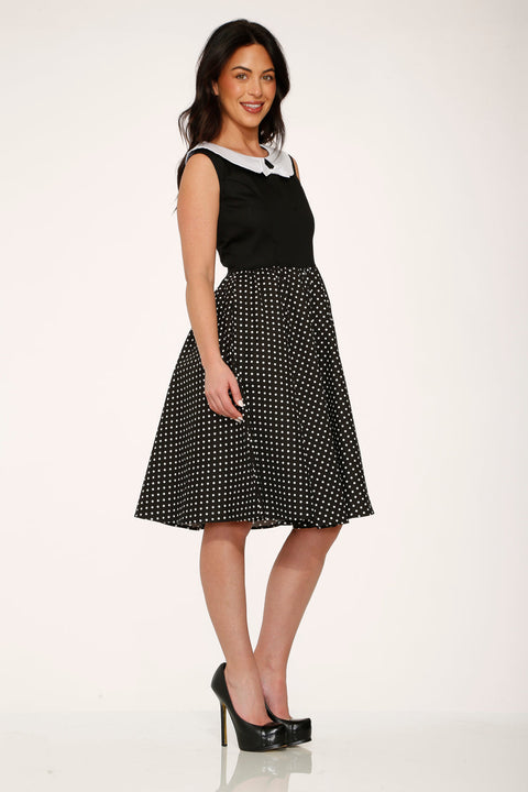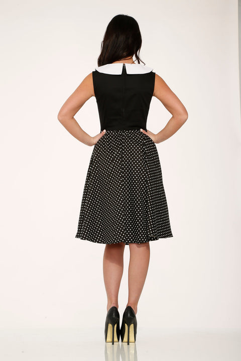 En tidlös snurr för varje tillfälle! Denna vintageinspirerade swingklänning kombinerar en klassisk svart överdel med en lekfull prickig kjol och skarpa vita kragedetaljer. Den åtsittande silhuetten smickrar varje kurva, medan dolda fickor och mjuk stretchig bomull håller dig bekväm från morgon till midnatt.