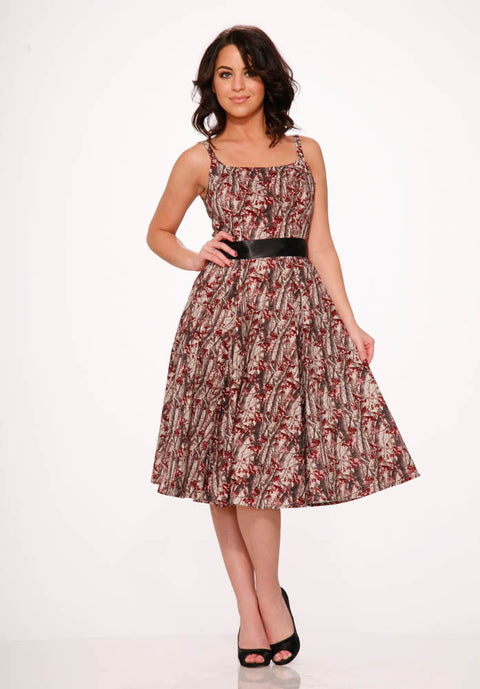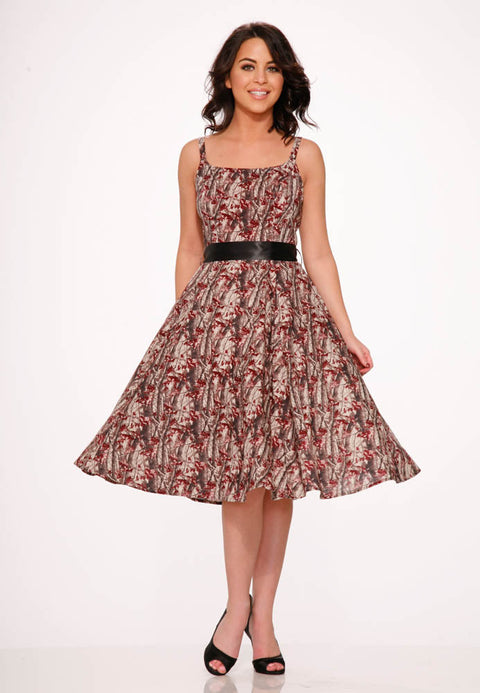 Kliv in i en skogsdröm med Orchid Bloom Sylvania Swing Dress. Denna vintageinspirerade klänning har ett charmigt skogstryck i rika, jordnära toner – perfekt för att ge din garderob lite sagoliknande infall. Justerbara flätade axelband och en satinmidja fulländar looken med stil.