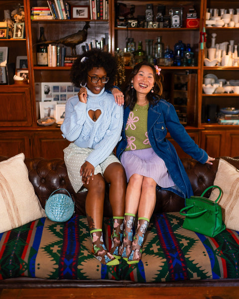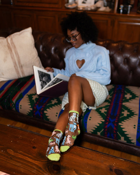 Vår svarta, tunna strumpa Dopamine Dogs är din källa till en daglig dos av lycka. Strumpan är full av personlighet och pryder färgglada och udda valpar i grönt, orange, rosa och vitt, vilket gör varje steg roligare. Den fräscha gröna manschetten, hälen och tån ger en lekfull vårkänsla, medan det svarta, tunna tyget gör din look avslappnad och elegant.
