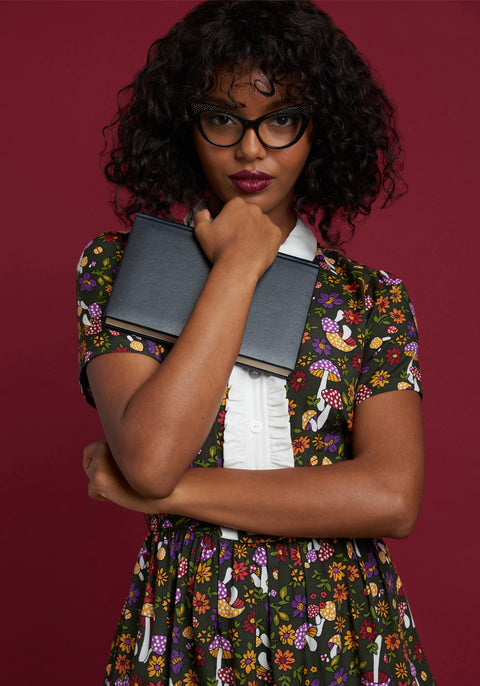 Som en hyllning till vår ursprungliga logotyp presenterar vi med glädje ett vackert nytt, handritat tryck med ett plyschigt mossgrönt skogsgolv fullt av bedårande champinjoner täckta i nyanser av rött, gult och lila, omgivna av glada blommor och små skalbaggar. Denna söta, åtsittande klänning är tillverkad av ett lätt vävt tyg och är enastående med sin kontrasterande vita prickiga krage och volangkantade knappslå vid överdelen. Med korta ärmar och ett matchande och avtagbart bälte vid den rynkade midjan som leder till en utsvängd kjol som går ovanför knäna med praktiska sidofickor, är denna 70-talsinspirerade miniklänning ett enkelt ”ja”.