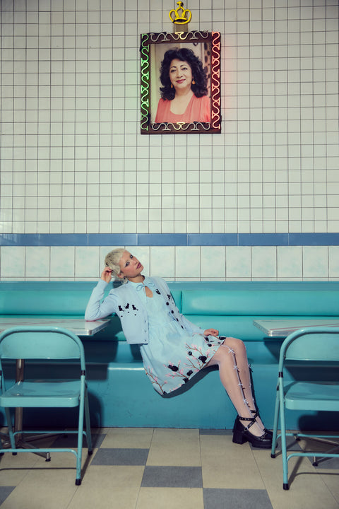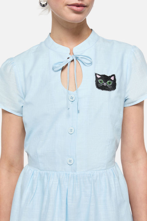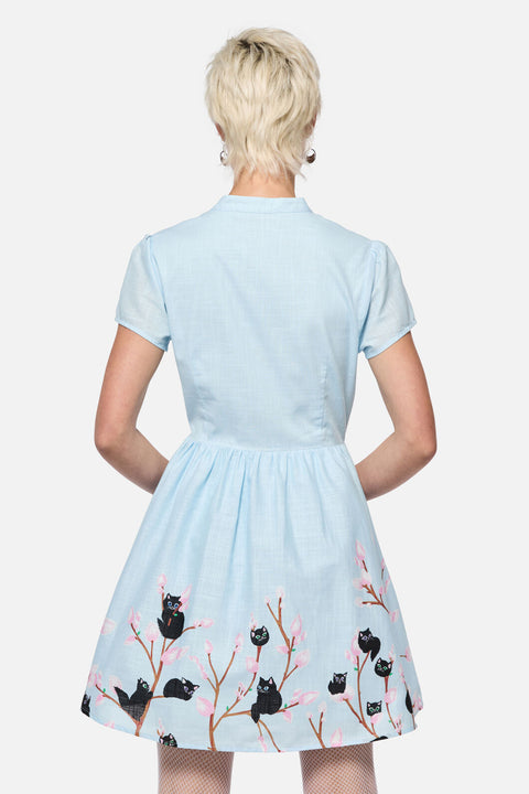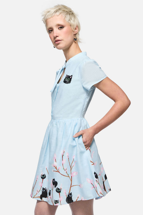 Så söt att det gör ont – Pussy Willow Border Dress från Dangerfield är en älskvärd blinkning till vintagestil med en fräck twist. Med specialdesignat ”Pussy Willow”-konstverk (ja, det där är kattungar som blommor!) är denna revival-inspirerade miniklänning perfekt för både modeälskare från 1940-talet och moderna dockor. Med en nyckelhålskrage och button-down-krage är den ett sant samlarobjekt för mönstrade och retroromantiker.