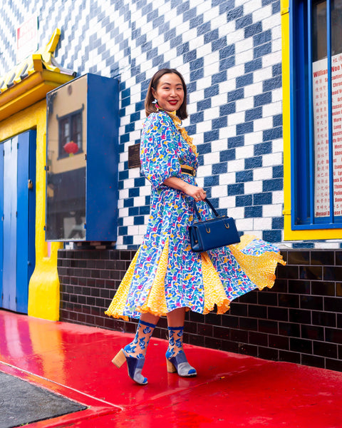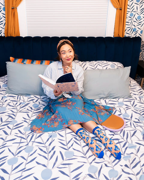 Blåbärsälskare, jubla! Vår transparenta strumpa Blueberry Ruffle har ett heltäckande blåbärstryck i olika nyanser av blått mot ett beige, transparent tyg. Vi har förhöjt designen med intrikata skuggningar på blåbären för att skapa en dimensionell effekt. Den har en blå volangkant för en flickig touch. Denna strumpa är det perfekta tillskottet till dina vårkläder.