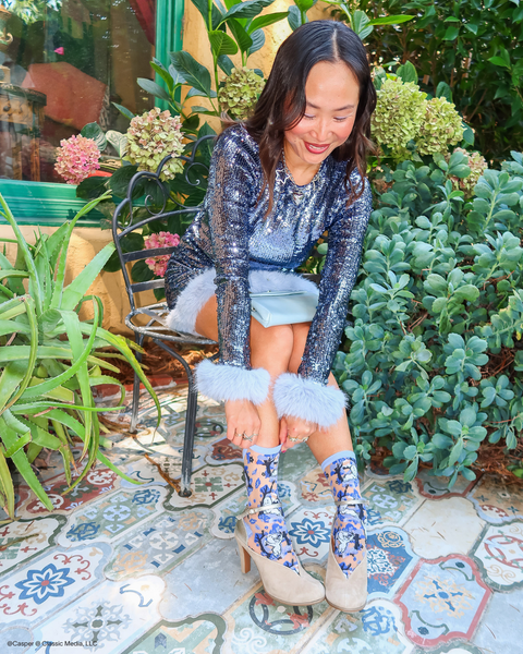 Gör dig redo att hemsöka din garderob (på sötaste möjliga sätt) med den Casper and Trees transparenta sockan – ett förtrollande samarbete mellan Sock Candy och Casper det vänliga spöket ! Dessa eteriska strumpor visar Casper själv som glatt svävar bland förtrollade blå och svarta träd som sticker ut mot en transparent bakgrund. Lavendelblå detaljer vid häl, tå och manschett ger en drömsk pastellfinish. Oavsett om du klär upp dig till Halloween eller bara vill ha en magisk twist på din vardagsstil, ger dessa strumpor en kusligt chic accent till din look.