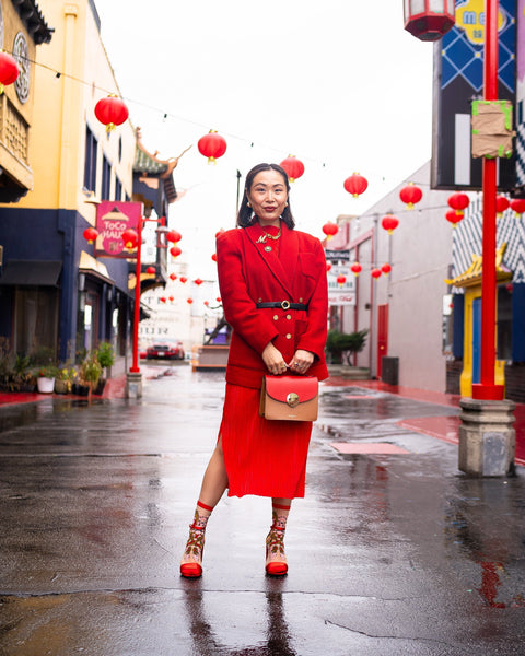 Fira kinesiskt nyår med vår fantastiska drakeårsstrumpa, som hyllar vår grundares arv. Två guld- och röda drakar speglar varandra och flätas samman, vilket skapar perfekt symmetri framifrån och en hel drake från sidan. Körsbärsblommor ger denna tunna drakesocka en feminin och oväntad touch. Matcha med röda skor och bär den hela februari, från kinesiska nyåret till alla hjärtans dag.