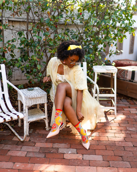 Inte för den räddhågsne, vår tunna strumpa Flower Power är djärv och ljus. Livfulla orangeröda, soliga gula och slående akvamarinfärgade blommor bryter ut mot en skir bakgrund och skapar den perfekta harmonin av funky och elegant. En mjuk rosa accent ger en oväntad twist, vilket gör denna strumpa till en riktig konversationsstartare.