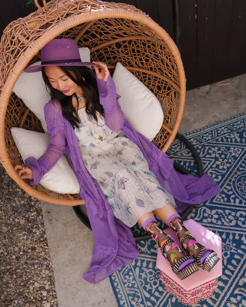 Vi vill inte skryta, men det här är de sötaste svamparna du någonsin kommer att ha på dina fötter. Släpp loss din inre boho-drottning och ge din look en touch av fantasi med våra svampstrumpor, kontrasterande till ett svart, skirt tyg för en mystisk känsla.