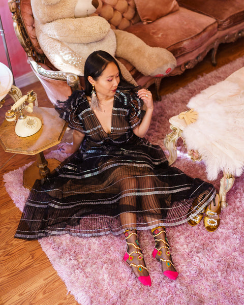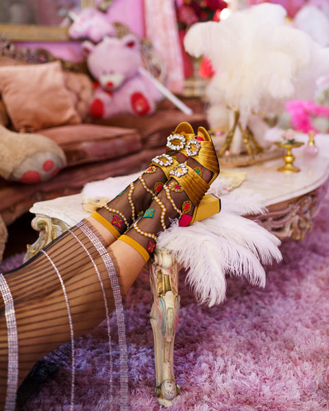 Pryd dina fötter med lyxiga pärlor och vintagejuveler för fina utekvällar. Med ett svart, skirt tyg är detta din favorit lyxiga svarta ankelstrumpa att para ihop med eleganta klackar för en oförglömlig look.