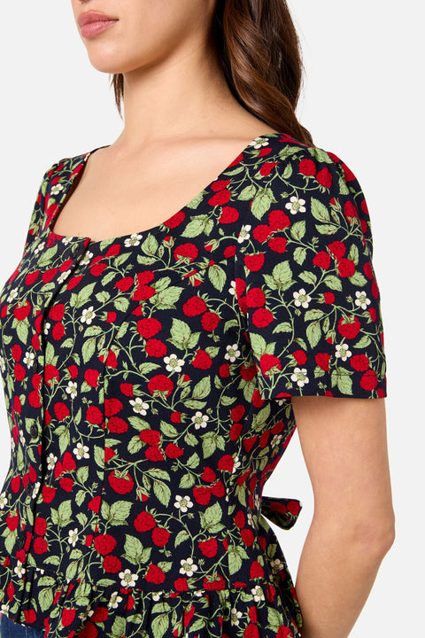 Lägg till en touch av lekfull charm i din garderob med den kortärmade toppen Raspberry från Princess Highway. Med ett livfullt tryck av saftiga hallon och fina blommor på en rik marinblå bas är denna söta topp i bomulls- och viskosblandning full av vintageinspirerad stil. Med sin mjuka fyrkantiga halsringning, puffärmar och volangkant är den ett must för både soliga dagar och avslappnade utflykter.