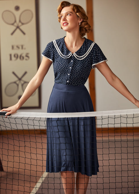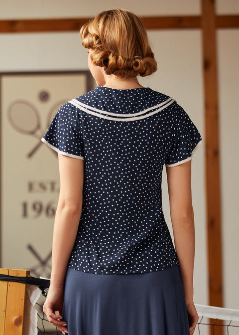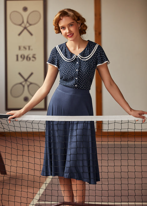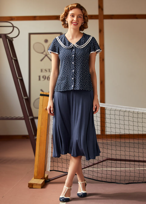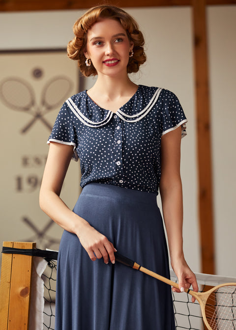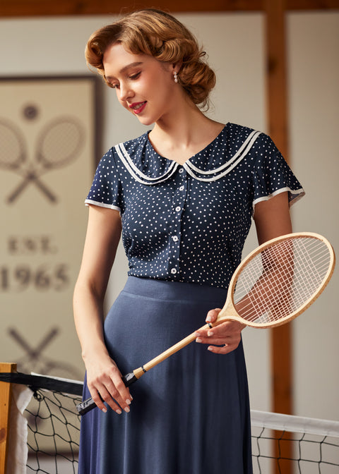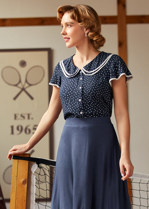 Kliv in i en sagolik stund med Polka Dot Daydream Collar Blusen från vårt namngivna märke ModCloth! Denna vintageinspirerade blus har ett sött marinblått och vitt prickigt tryck, fladdrande korta ärmar och en charmig lager-på-lager Peter Pan-krage med fin kontrastkant för en extra touch av fantasi. Som gjord för att snurra genom soliga eftermiddagar eller för att ge din vardagslook en retro-chic touch, passar denna blus perfekt med högmidjade jeans eller en swingkjol för tidlös elegans. Oavsett om du smuttar på te i trädgården eller promenerar genom en pittoresk stad, kommer denna söta topp garanterat att få varje dag att kännas magisk.