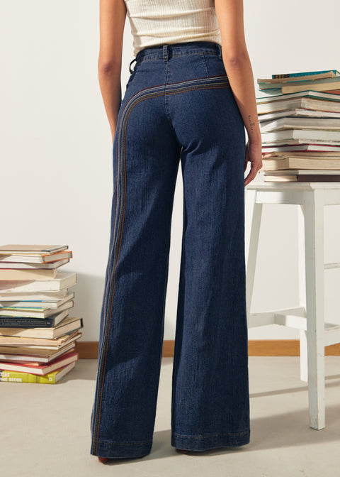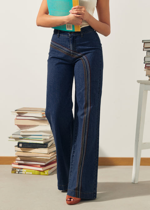Dyk ner i 1970-talet med dessa ModCloth-jeans! Regnbågsdekorerade och har en klassisk högmidjad, vida bensilhuett. Den mörkblå nyansen är tillverkad av en lättstretchig denimblandning av 70 % bomull, 28 % polyester och 2 % spandex. Vår denim (270 g efter tvätt) är avsiktligt lätt för att skapa det karaktäristiska fallet och böljande snittet.Polyester ger styrka och formbevarande egenskaper, standard för premiumdenim. Gylf med dragkedja och knappstängning ger en modern touch. Roy G Biv-broderi löper framifrån och bakåt, vilket ger en unik känsla.
